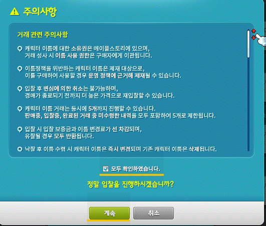 ※ 경매로 캐릭터 닉네임을 받은 후 '단순 변심'에 의한 취소 불가능