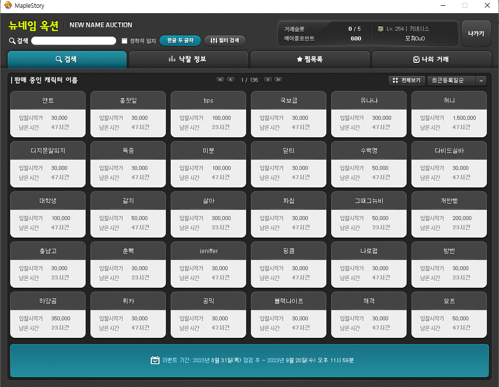 ※ 경매 종료 시, 최고 가격 입찰자가 캐릭터 이름을 받을 수 있다.