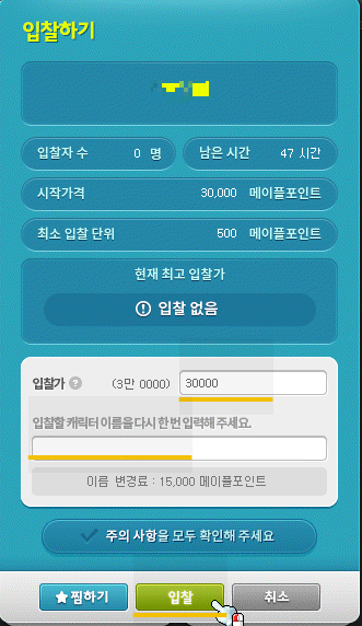 2) 입찰 시작가 보다 '높은 금액 입력'하고 원하는 이름 입력