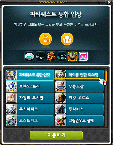 3) 메이플 연합 회의장 선택 후 '이동하기' 클릭