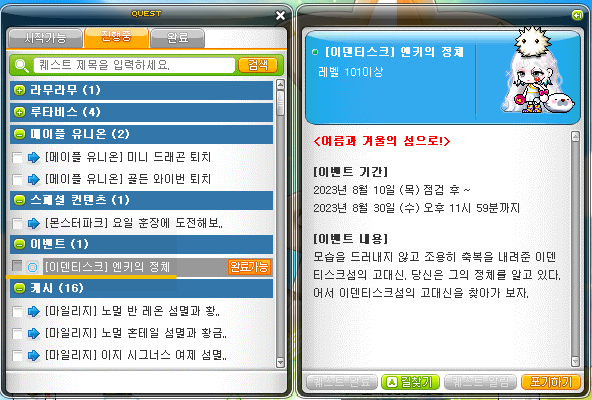 1) 왼쪽 중간에 '별모양' 클릭해서 '이덴티스크 : 여름과 겨울의 섬' 이벤트 퀘스트 받기