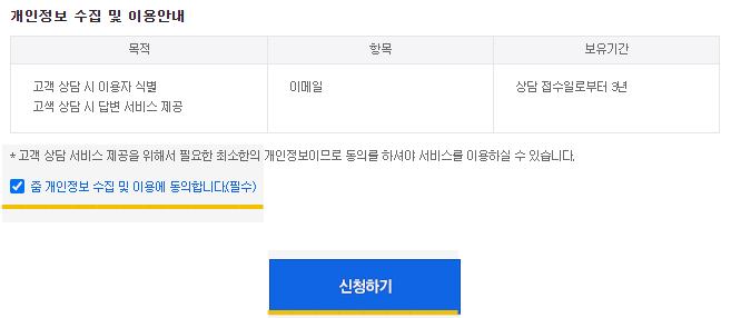 3) 양식 작성 후 '체크' 하고 '신청하기' 클릭