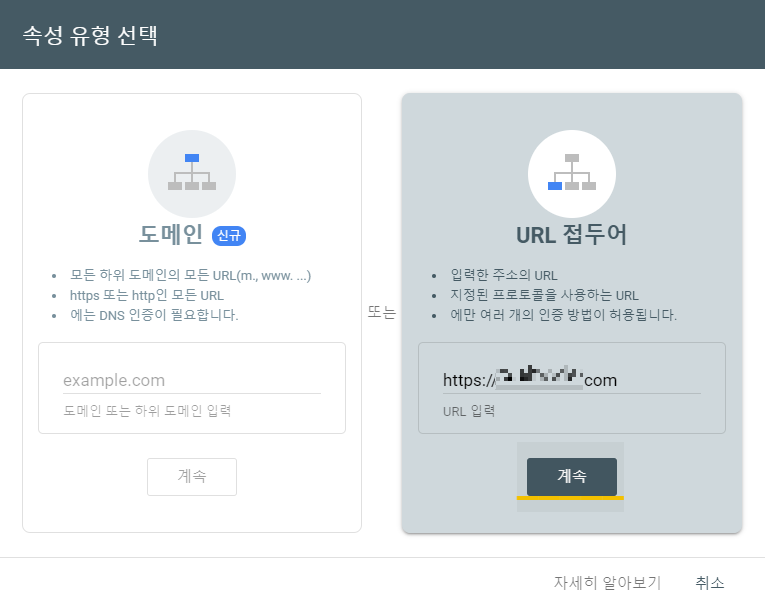7) 'URL 접두어' 누르고 티스토리 블로그 하위도메인 입력 후 '계속' 클릭