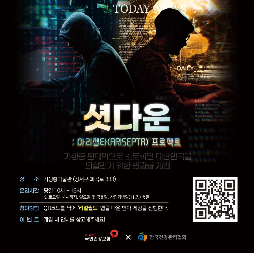 서울 강서구 한국건강관리협회 기생충 박물관에서 모바일 기반 미션형 체험 방탈출 게임인 셧다운 체험공간을 연말까지 운영한다고 합니다. '셧다운'은 건강보험이 사라진날이라는 주제로 만들어진 방탈출 게임입니다. 기생충으로 전염병의 세계적 유행인 펜데믹 상황이 벌어지고 사라진 건강보험의 데이터 복구를 위해 백업데이터를 찾아가는 게임입니다.