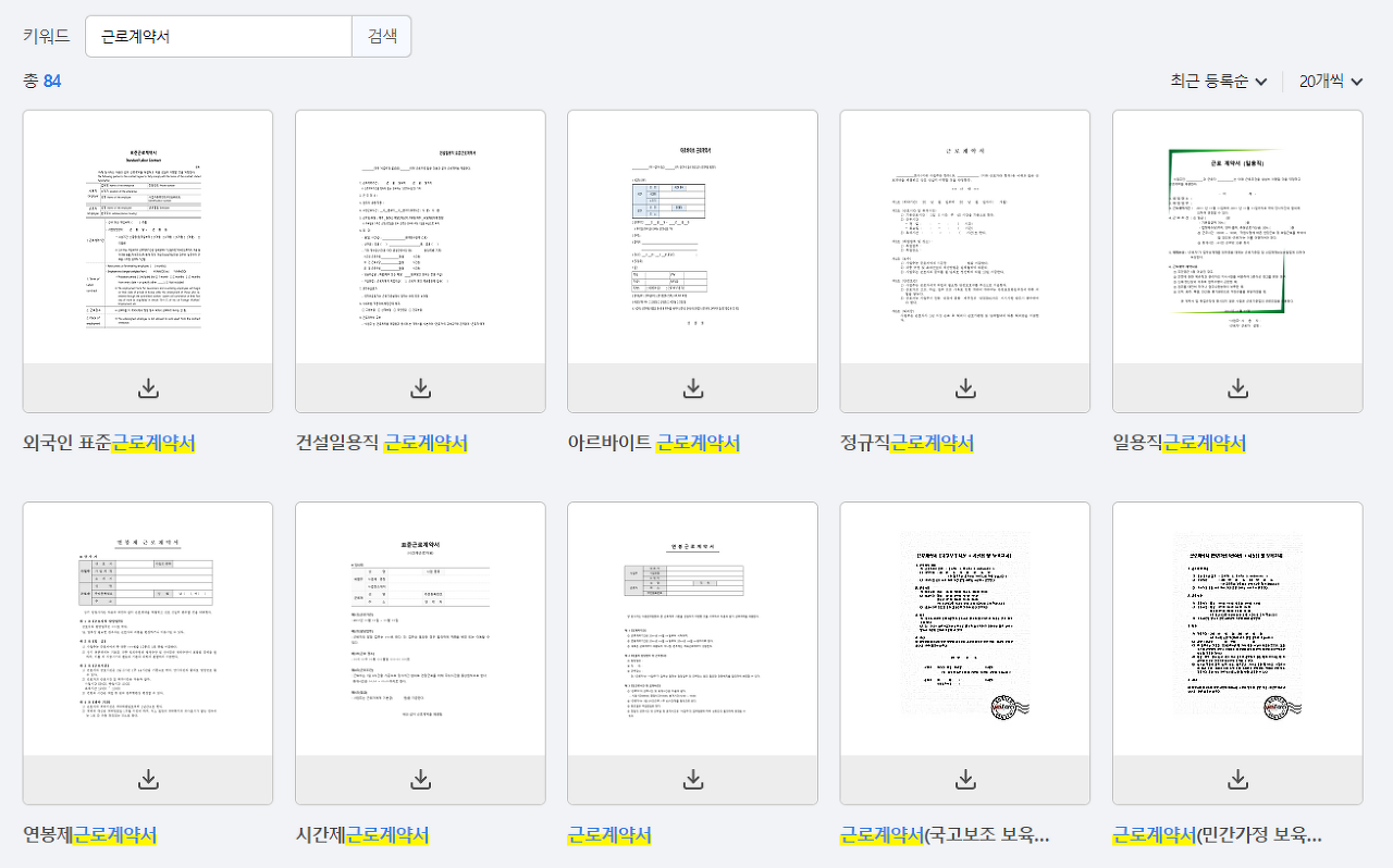 아래의 버튼을 통해 들어가면 다양한 종류의 근로계약서가 있습니다.