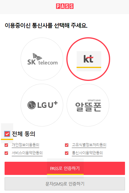 3) 본인 '핸드폰 통신사' 누르고 전체동의 '체크' 후 '문자(SMS)로 인증하기'를 클릭합니다.
