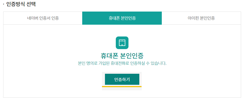 2) '휴대폰 인증'을 누르고 '인증하기'를 클릭합니다.