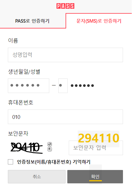 4) 성명,주민번호 앞자리,휴대폰번호, 보안문자 입력하고 '확인'을 클릭합니다.