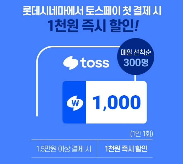 롯데시네마에서 토스페이로 15,000원 이상 최초 결제 시 1천원 즉시 할인이 적용됩니다.