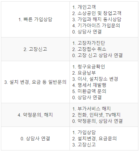 유선상품 ARS 메뉴