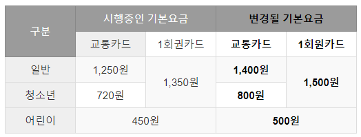 - 교통카드 : 변경될 기본요금