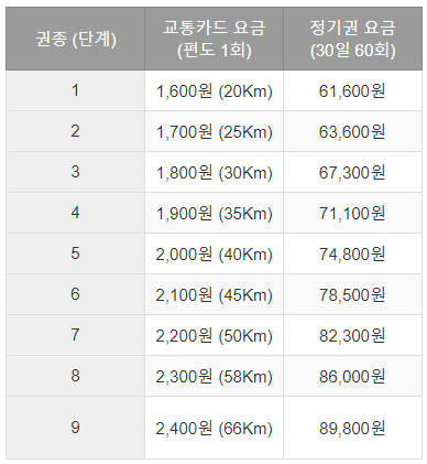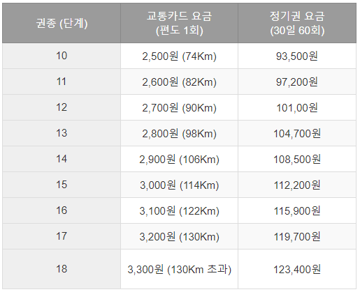 ※ 거리비용 (2단계 ~ 18단계) : 63,600원 ~ 123,400원 (해당 교통카드 편도 기본요금 × 44회 × 15% 할인)