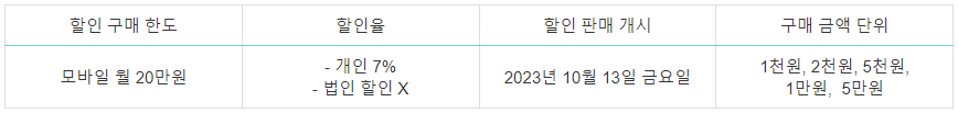 2023년 10월 13일부터 창원시에서 누비전 (창원사랑상품권)을 할인판매 시작한다고 합니다. 이번 모바일형 판매는 개인은 7% 할인되고, 법인할인은 없습니다. 선착순으로 조기종료 될 수 있으니 포스팅 보시고 할인받고 구매하시기 바랍니다.
